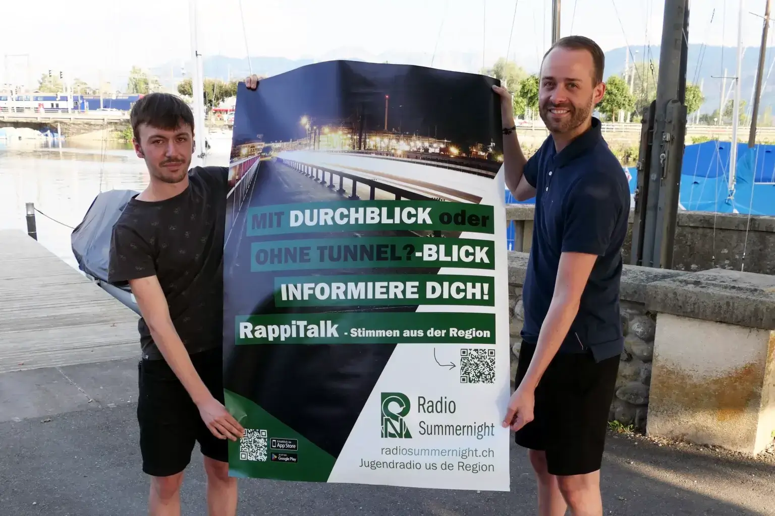 Dieser Beitrag wurde bereits am 12. Juli veröffentlicht. Am Hafen von Rapperswil mit Bilck auf den geplanten Stadttunnel diskutieren Robin Fretz und Thierry Gasser zur Abstimmungsvorlage.